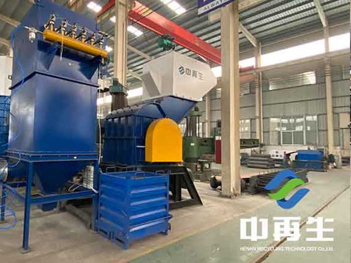 廢鋼鐵原料通過鏈板或皮帶輸送機運至進斜,進料斜面上裝有可轉動的一高一低的兩個碾壓滾筒將其壓扁并送入廢鋼破碎機內(nèi)。在破碎機機體內(nèi),有多個固定在主軸上的圓盤及多個安在圓盤之間可以自由擺動的錘頭,高速旋轉產(chǎn)生的動能來對廢鋼鐵進行砸、撕、破碎處理,使廢鋼處理成團狀,可穿過下部或頂部的篩網(wǎng),落入振動輸送機上。